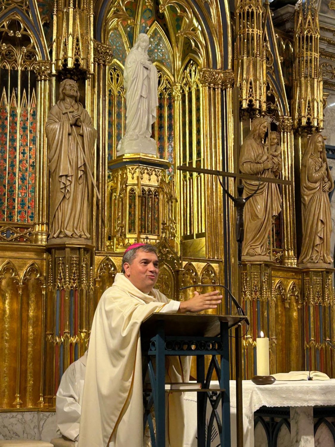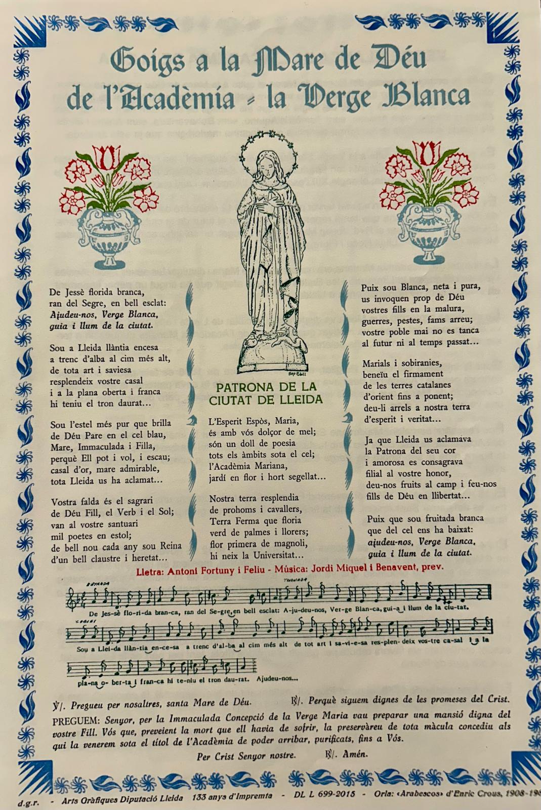 La capella de l’Acadèmia Mariana, que conserva la imatge de la Verge Blanca de l’Acadèmia, ha acollit avui l’eucaristia en honor a la patrona de la ciutat de Lleida. Presidida per primer cop pel bisbe Daniel, la celebració ha acabat amb el tradicional cant dels goigs a la Mare de Déu amb l’acompanyament musical del Petit Cor durant tota la celebració.
